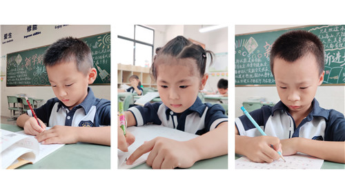 每天中午20分钟的练字,同学们严格执行老师的“三个一”标准:手离笔尖一寸、胸离桌子一拳、眼离书本一尺。手法熟练,起笔运笔收笔一气呵成!“点如瓜子、撇如剑、捺如刀”,方块字在同学们笔下呈现出铁画银钩,孩子们的精气神在汉字里边体现得淋漓尽致。