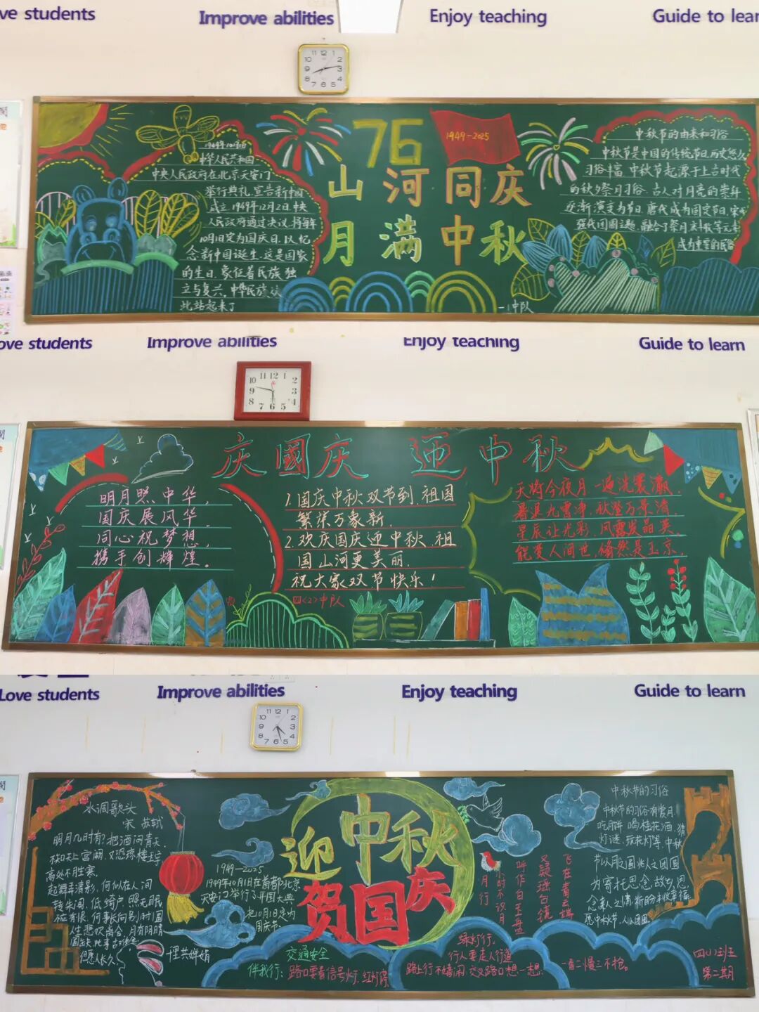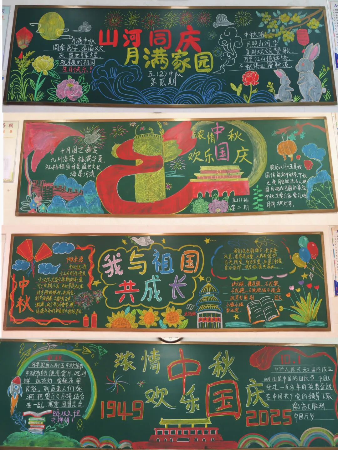 各班的板报设计巧妙融合了国庆的庄重热烈与中秋的浪漫温馨。一方黑板,成为了家国情怀最生动的注脚,让每一位同学在欣赏之余,深感国是千万家、有国才有家的深刻含义。