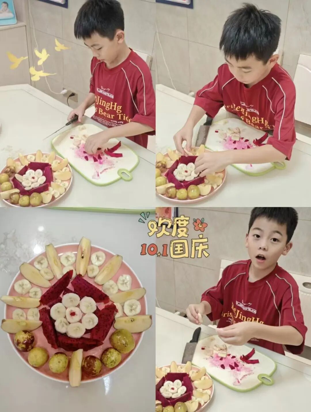 当国庆的欢腾遇上中秋的温馨,“家国”二字拥有了最完美的注解。同学们纷纷开展“双节主题水果拼盘”创作活动。这份独具匠心的实践,不仅是一次亲子协作的快乐体验,更是一次对“家是最小国,国是千万家”的深刻领悟。