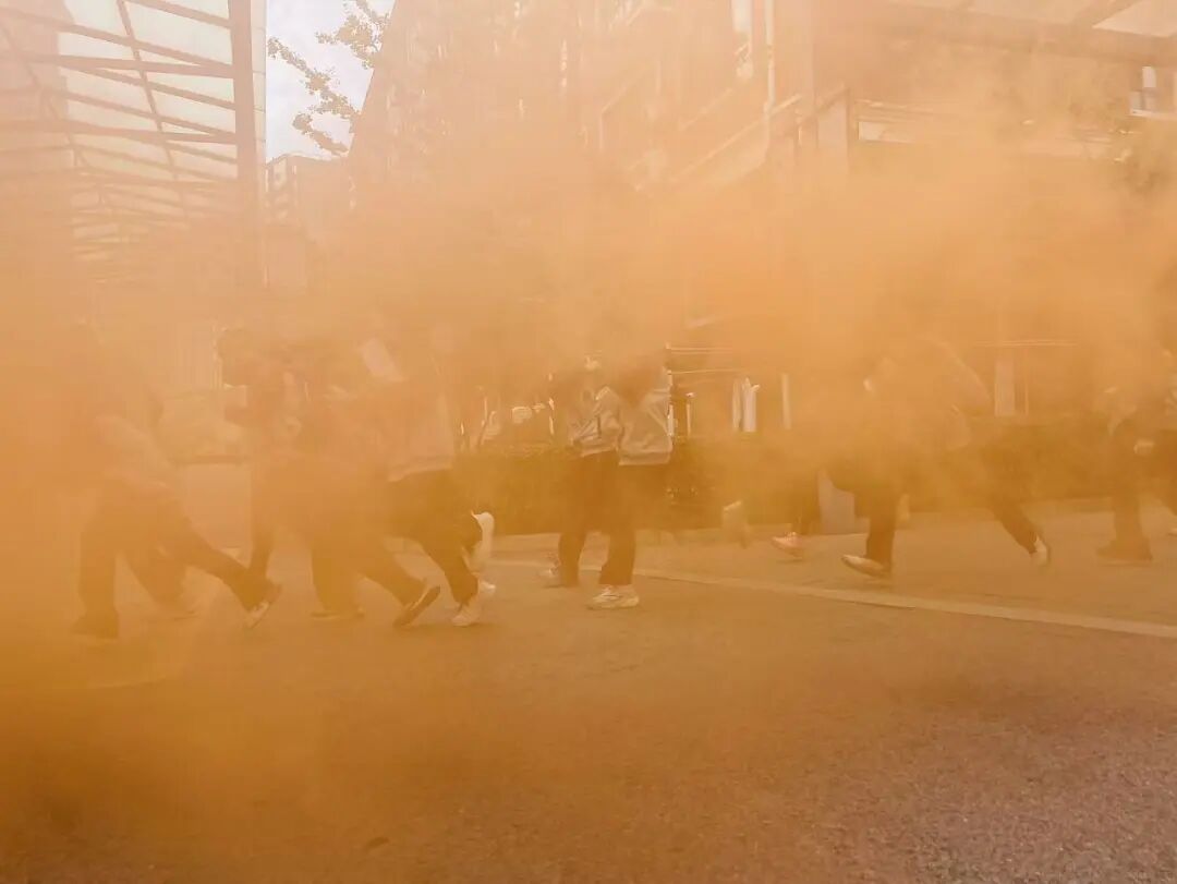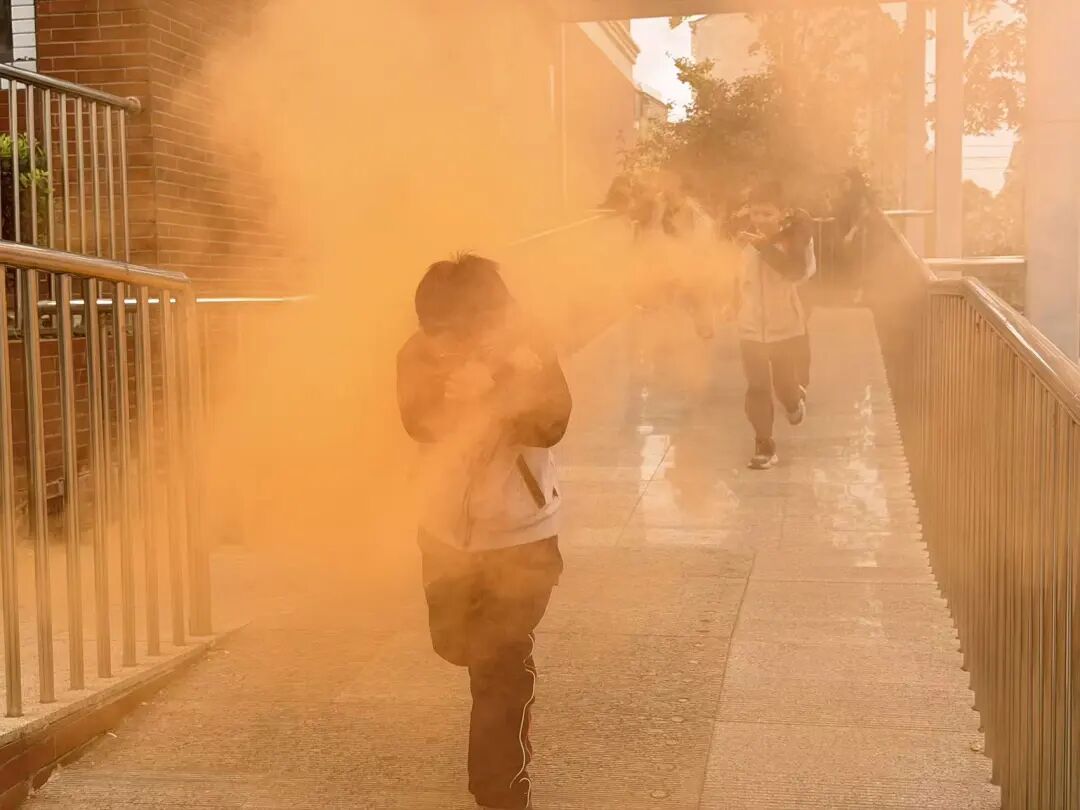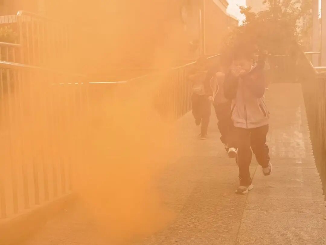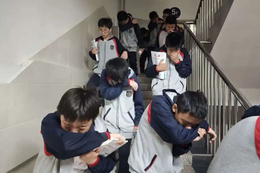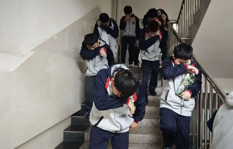 紧接着,一声“着火了”的声音出现,消防应急疏散演练正式开始。全体师生马上进入戒备状态,教师们组织学生捂住口鼻,弯腰俯身,按照路线图规定的顺序,从宿舍东西两个楼梯口分别撤离。前往操场的安全区域集合。整个疏散过程紧张有序,师生们行动迅速,展现了良好的应急反应能力。