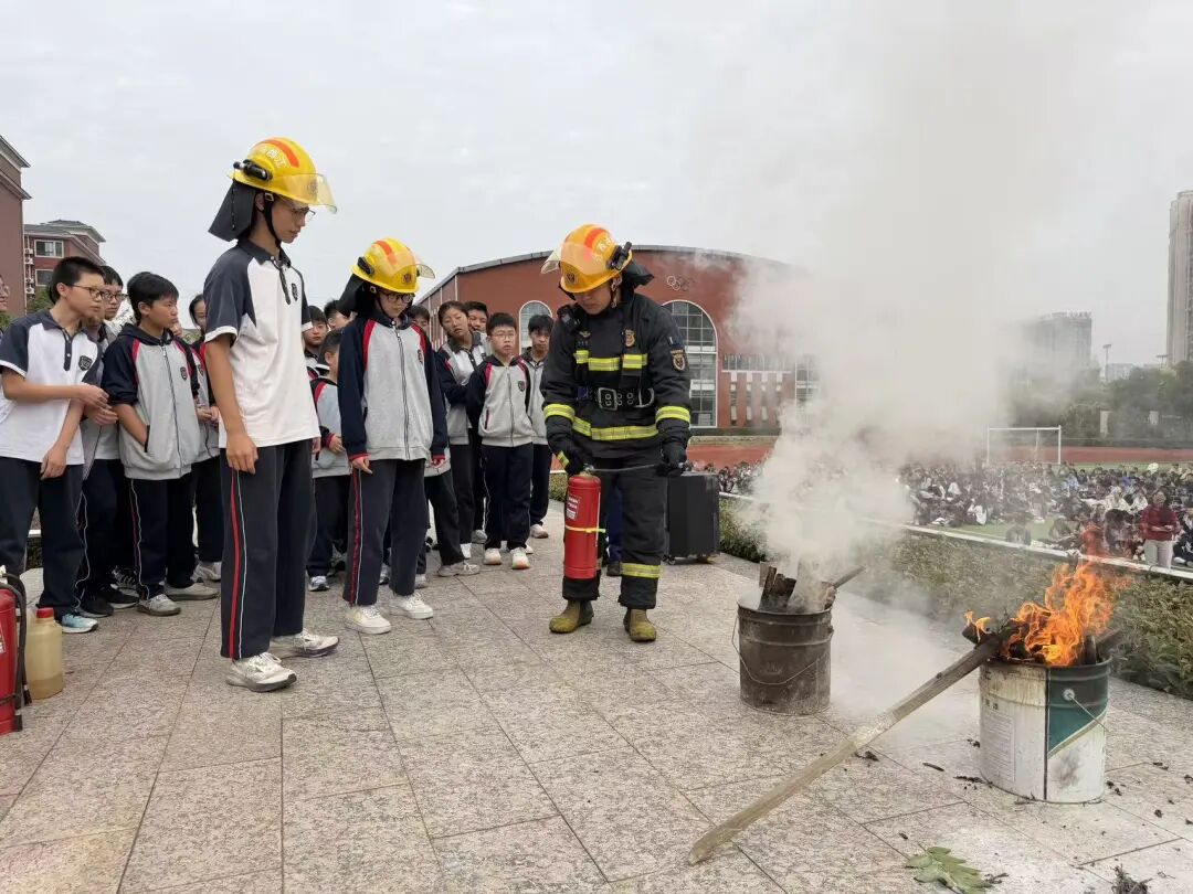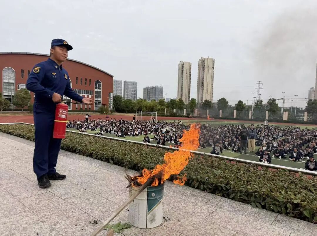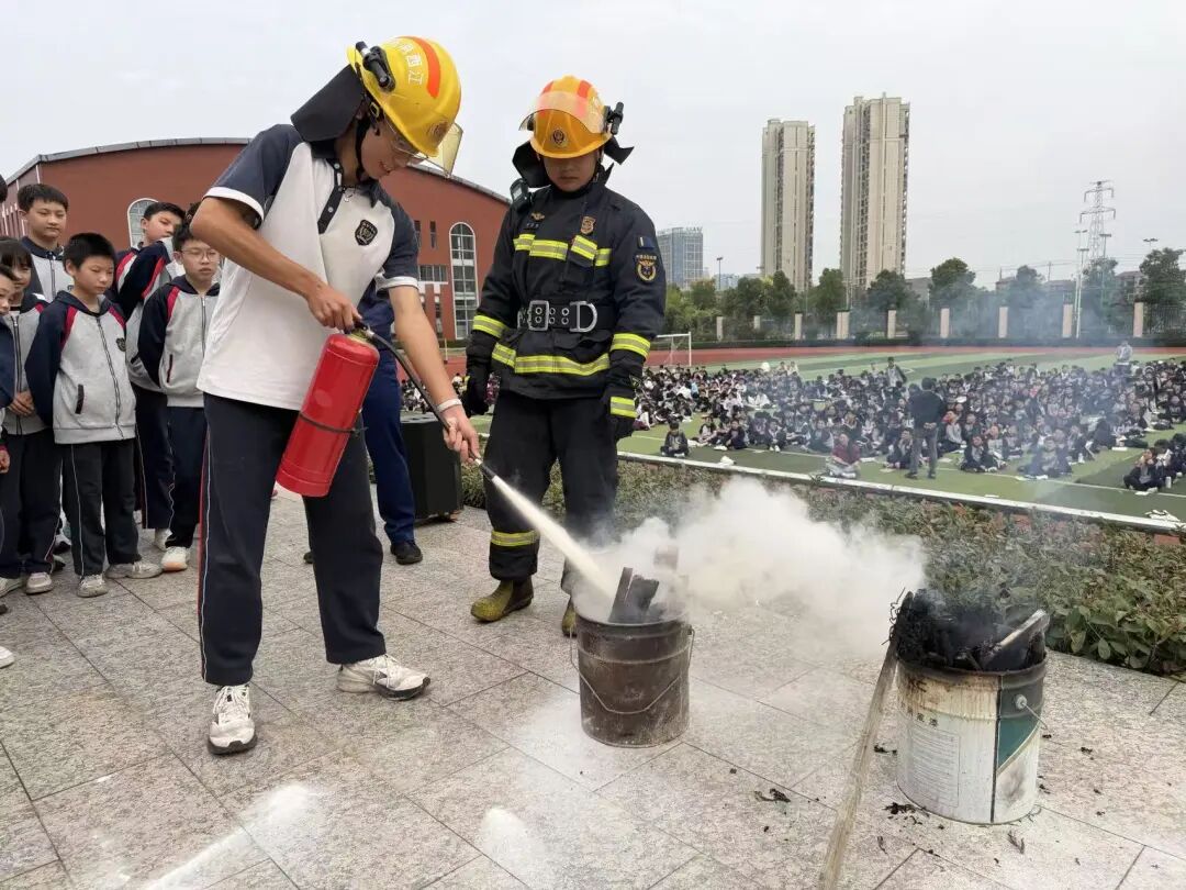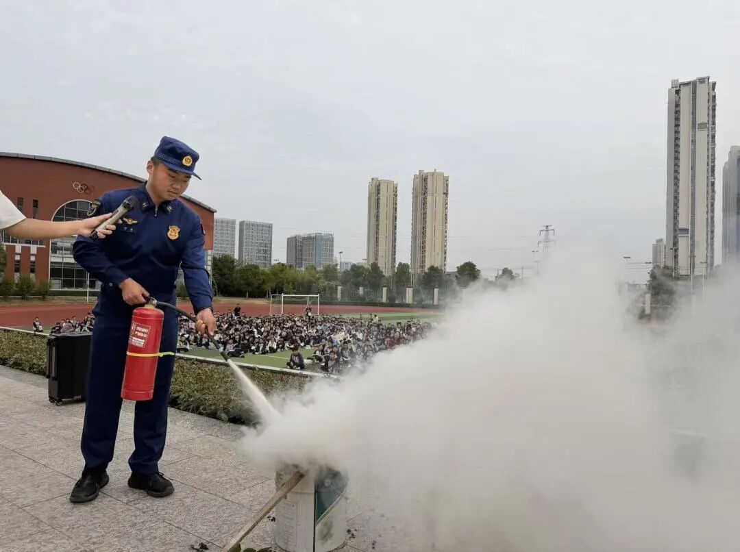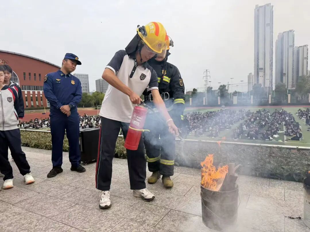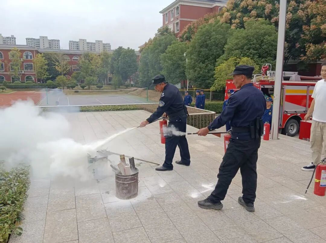 为巩固学习内容,现场还进行了实际操作演示,让大家直观地感受消防器材的威力和正确使用方法。消防员邀请学生代表亲自使用干粉灭火器进行灭火,安保人员学习如何使用水枪。通过实操学习,实现了成功灭火,达到“真学、真练、真会”的效果。