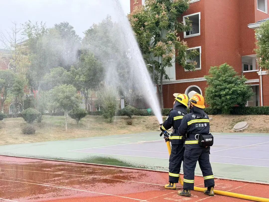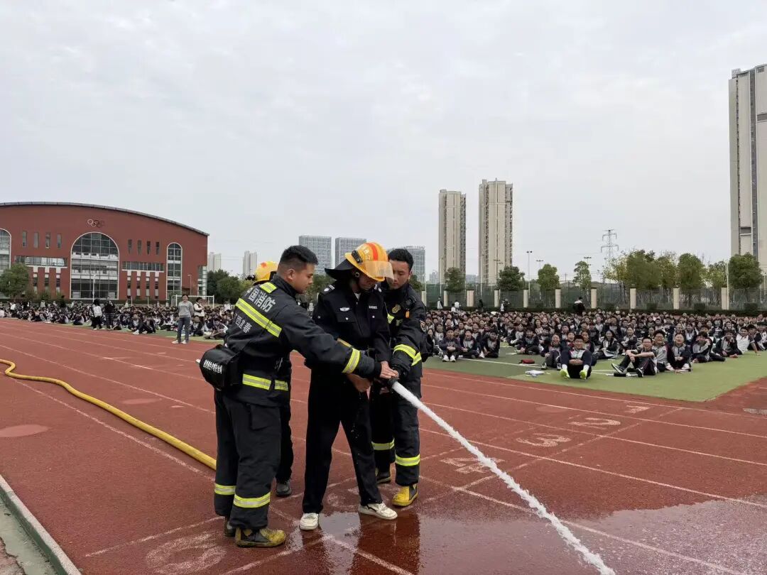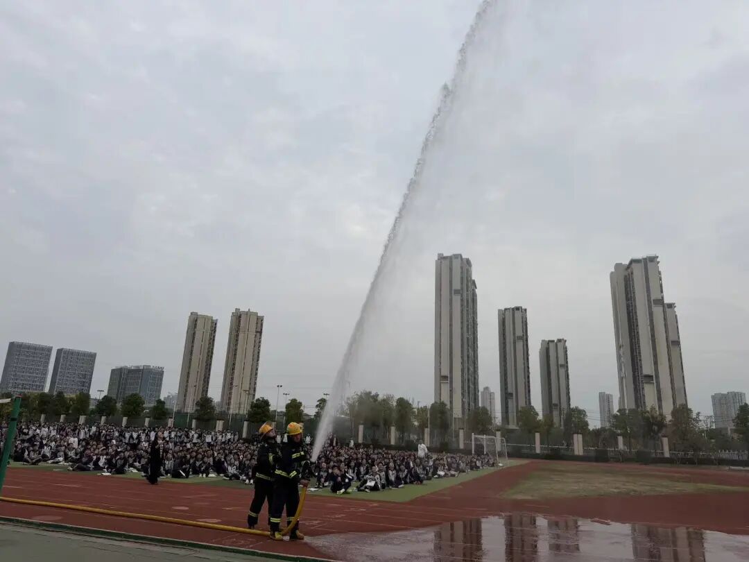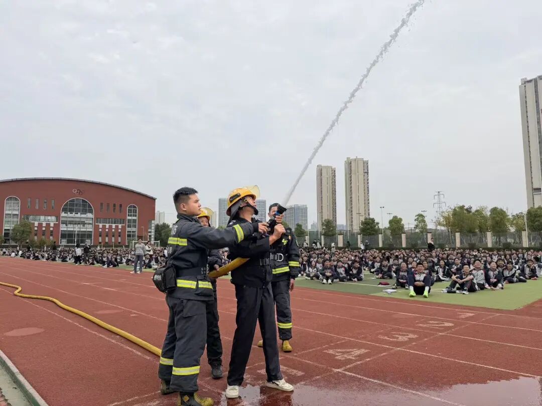 最后消防员模拟喷水救火,水枪里的水压缩为水柱,喷出十几米远。在看到高压水枪喷水的一瞬间,全场沸腾了,学生们大声地为消防员鼓掌、欢呼。