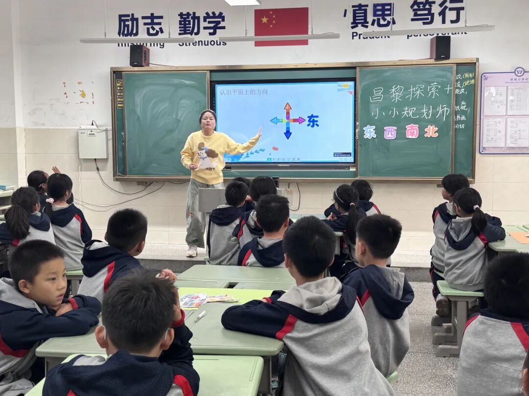 在数学融合课中,苏老师围绕生活中的方向提出问题提问:“除了东方,你们还知道哪些方向?” 学生们踊跃举手发言,主动参与到课堂中。