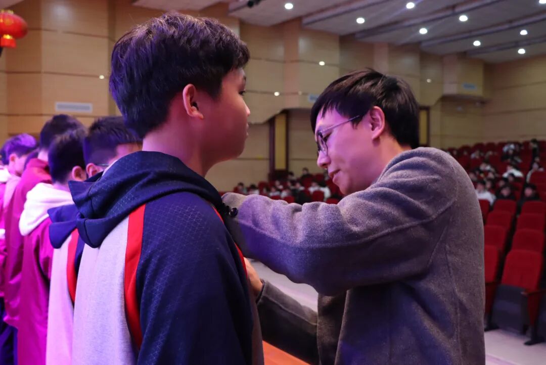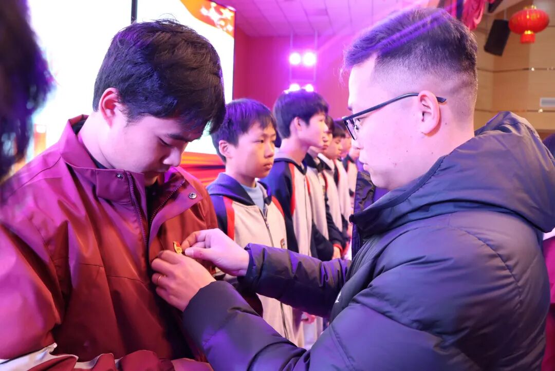 在隆重的音乐中,新团员分年级依次上台。校领导们为新团员代表颁发团章、团员证,并为他们佩戴上熠熠生辉的团徽。佩戴团徽时,主持人深情解说:“齿轮与麦穗环绕初升太阳,象征着共青团在党的领导下团结各族青年,朝着党所指引的方向奋勇前进。”这一刻,荣耀与责任在新团员胸中激荡。